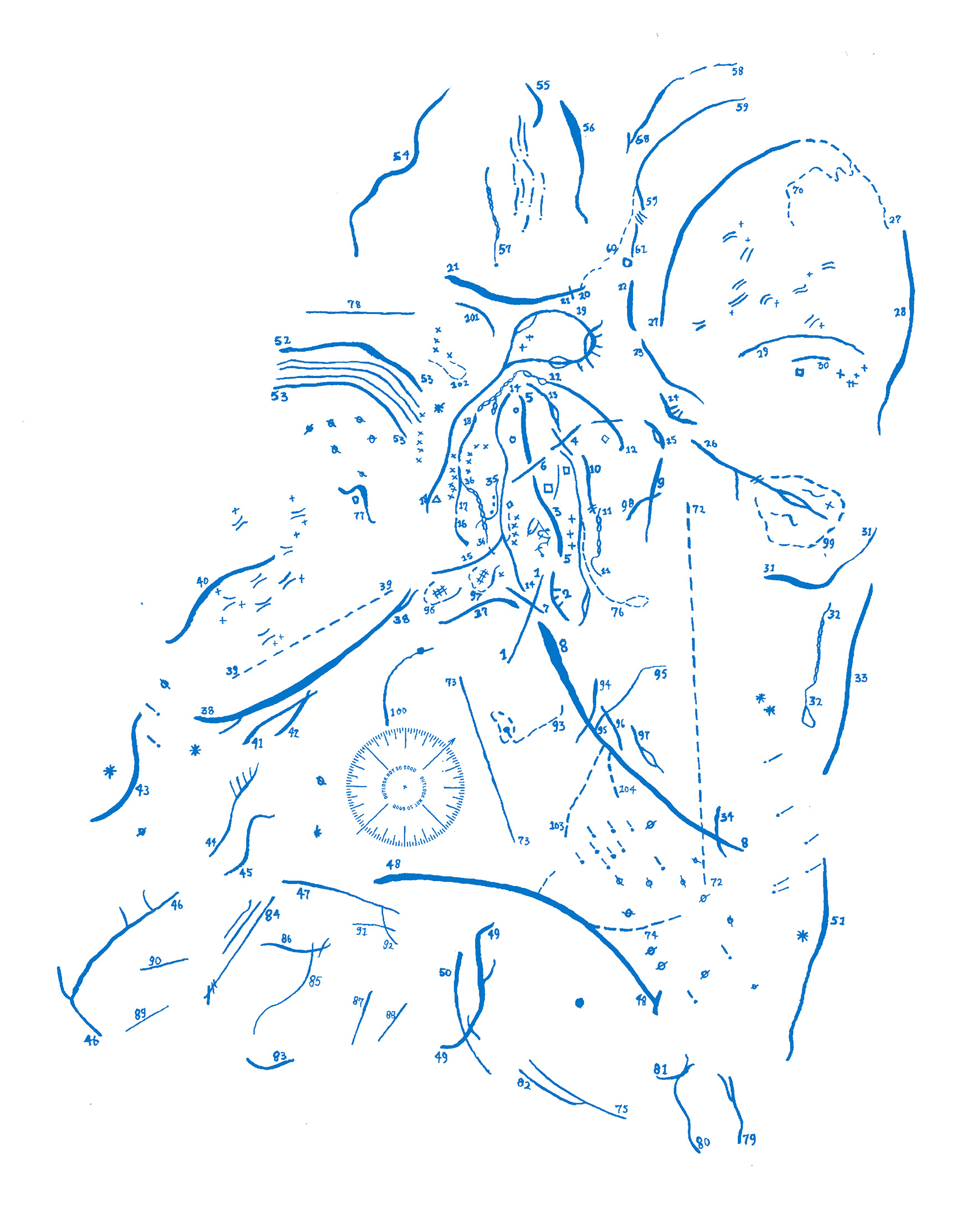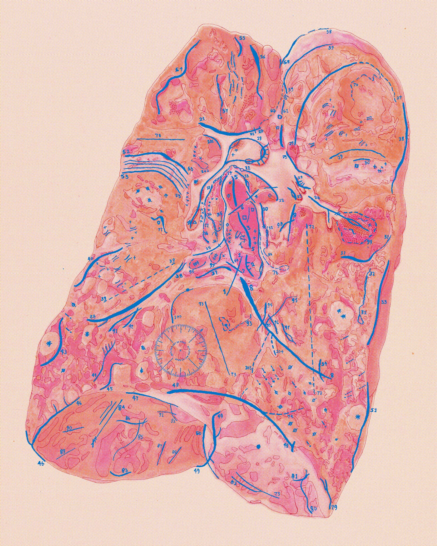 Body and landscape are combined into a “divination device” or map, in the manner of the Haruspex (diviner of internal organs) and the Geomancer (diviner of markings on the ground). It is inspired by ancient clay models of animal organs, while borrowing from modern truth-telling devices such as palmistry guidebooks, magic 8 balls, and precision cartography.