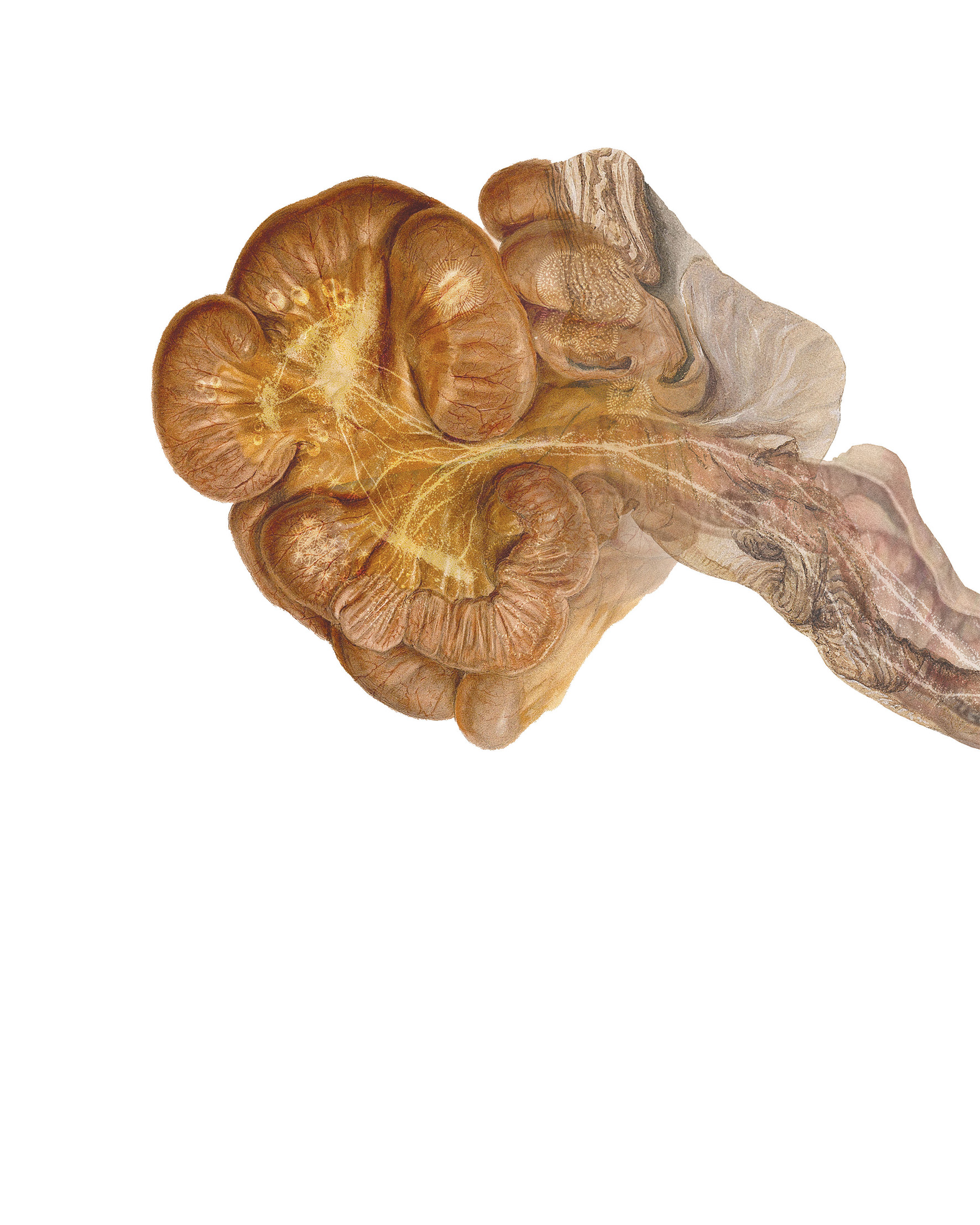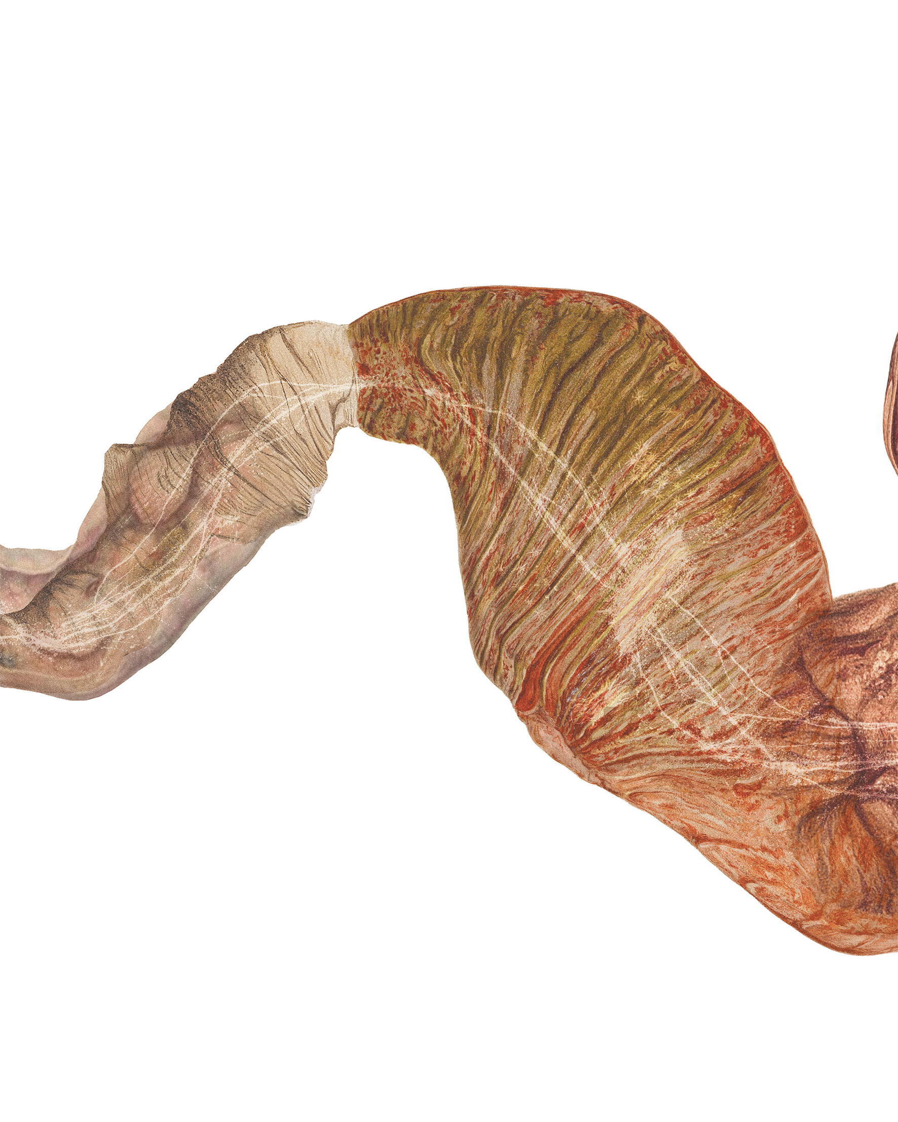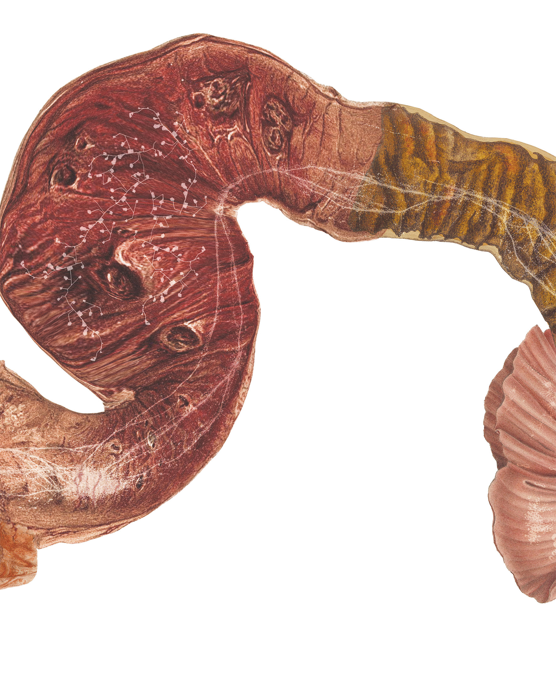 As they migrate in search of food, ruminants (like elk) ingest flora which is held in their multi-chambered stomachs for microbial fermentation before being digested. Stitched together from archival veterinary and medical illustrations, this drawing collapses terrestrial and microbial migrations into a single landscape.